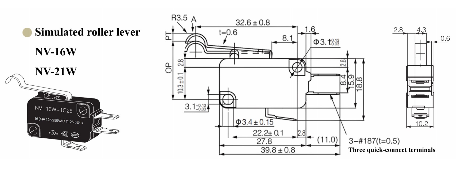 Le Micro Switch NV-16W est un commutateur de pointe qui combine des fonctionnalités avancées pour répondre à un large éventail d'exigences.Avec sa conception de levier à rouleau simulé, cet interrupteur haute performance garantit un actionnement précis et fiable.Il fonctionne en utilisant un levier qui déplace un rouleau simulé contre un ensemble de contacts, permettant un contrôle et une détection précis.